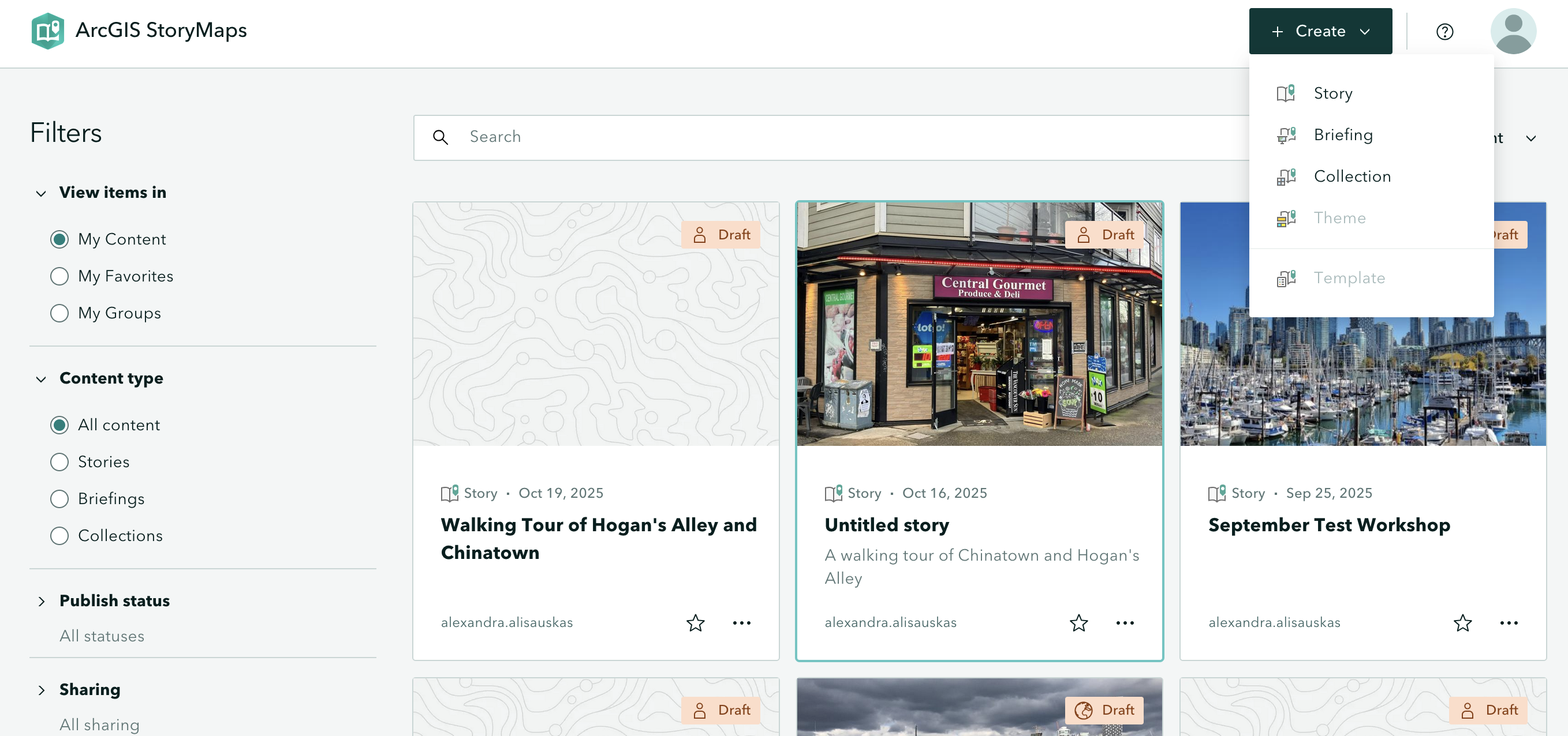 After creating a free Storymap account, navigate to storymaps.arcgis.com/stories and Sign In. Click Create story.