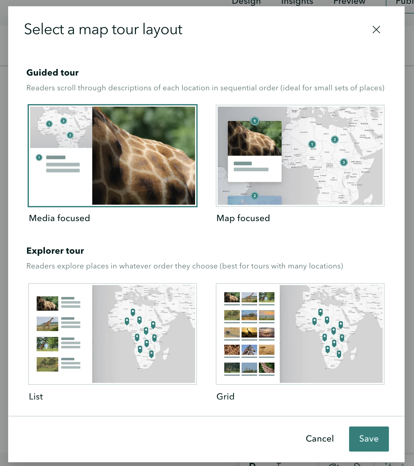 You can create a map tour to showcase a set of places. You can decide whether your readers get to explore these places in any order, or are led through in an order of your choosing.